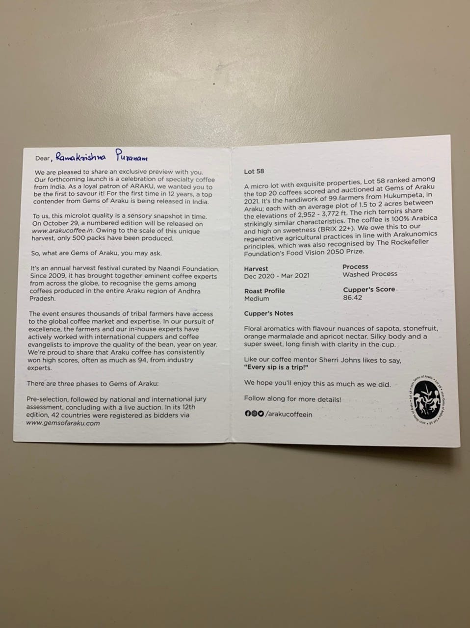 A micro lot with exquisite properties, Lot 58 ranked among the top 20 coffees scored and auctioned at Gems of Araku 2021. It’s the handiwork of 99 farmers from Hukumpeta, in Araku; each with an average plot of 1.5 to 2 acres between the elevations of 900 – 1150 masl. The rich terroirs share strikingly similar characteristics. The coffee is 100% Arabica and high on sweetness (BRIX 22+).